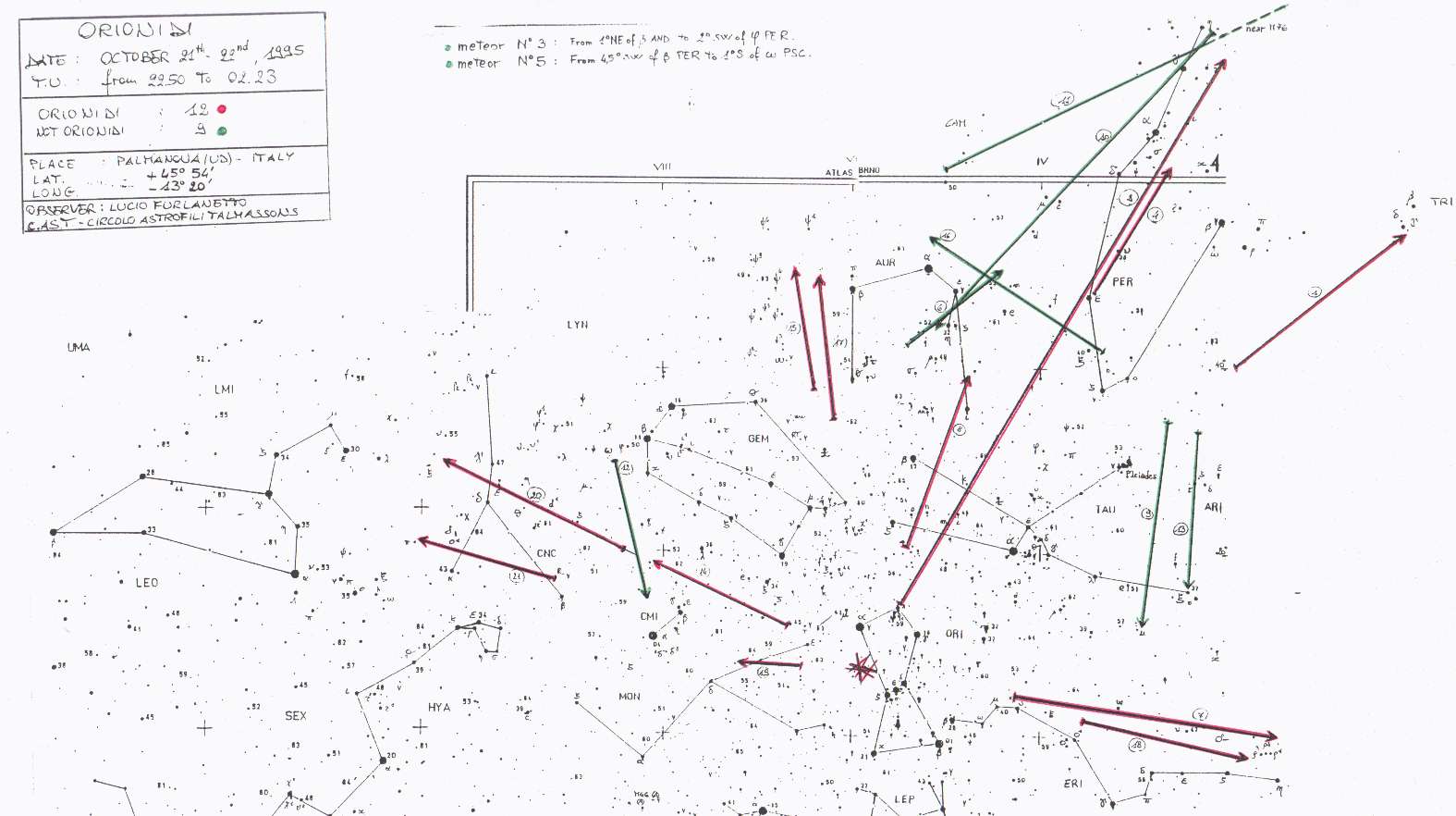 | 5 | 21.10.1995 | 23.10 | 1 | V | BIANCO | DA 2° S/4° W DI BETA PERSEUS A OMEGA PISCES | NON ORIONIDE |