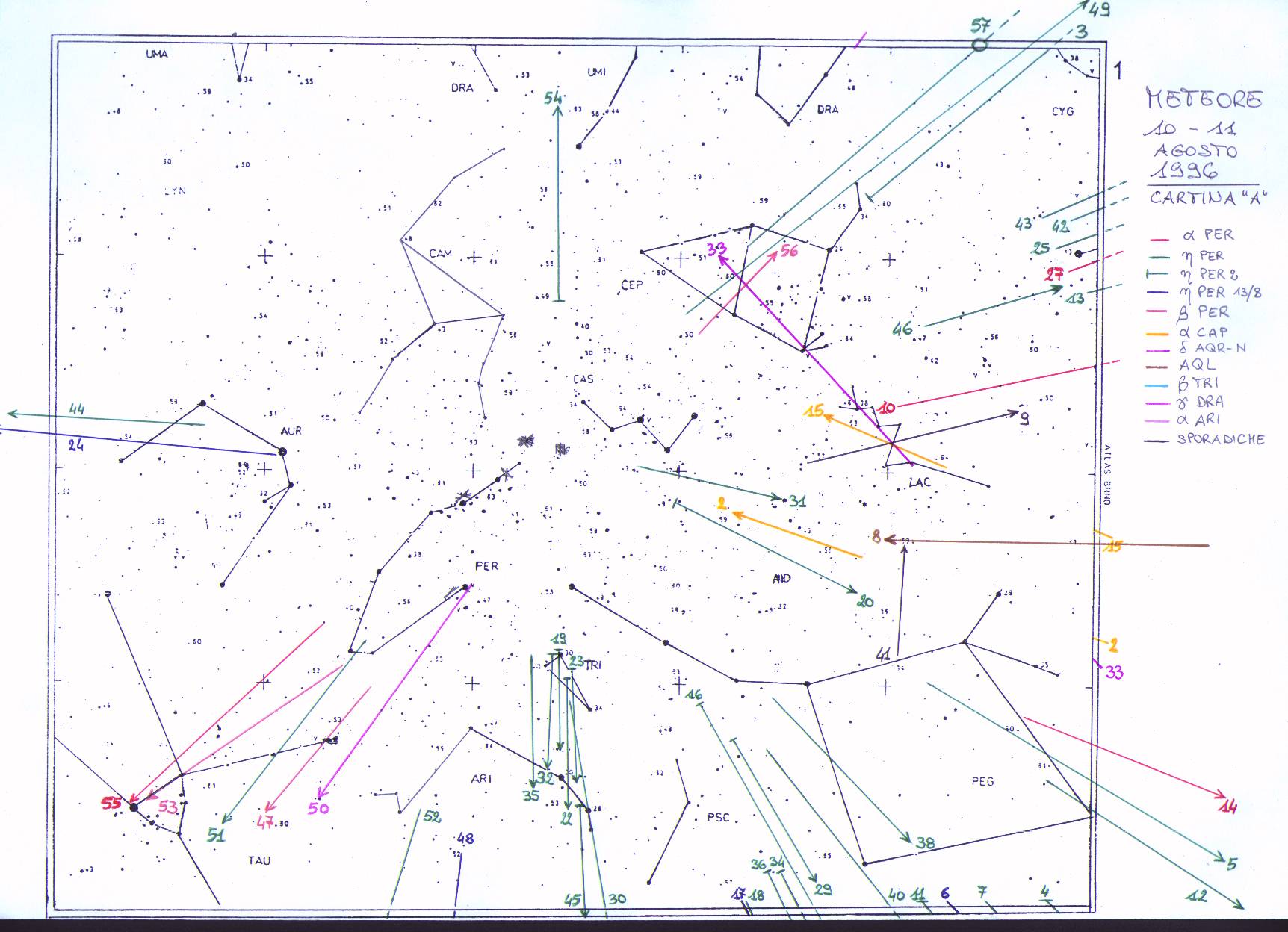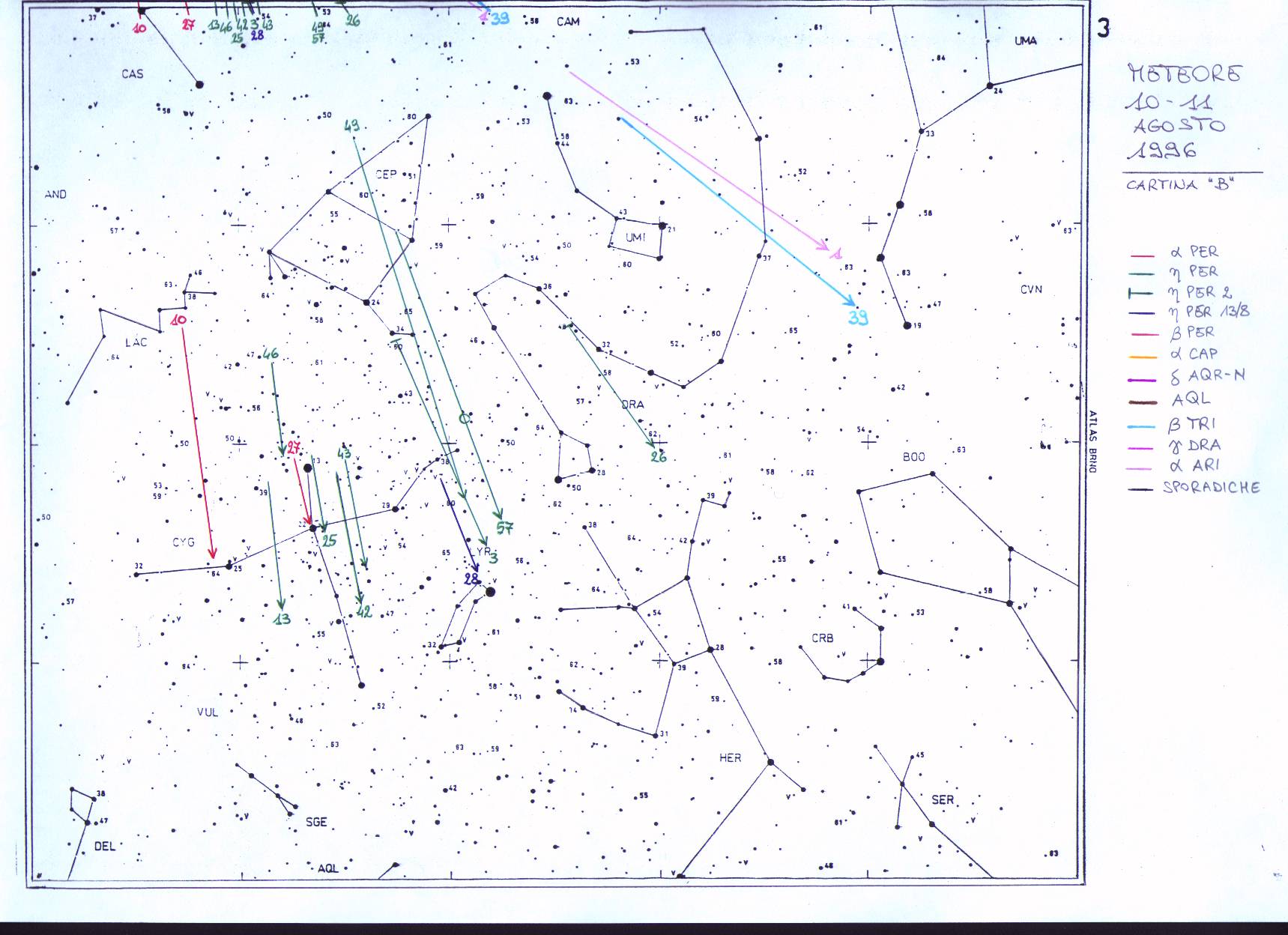 | 33 | 11.08.1996 | 00.38 | DELTA AQR-N | -1 | V | LACERTE / CEPHEUS | 1 SEC.; BIANCO; SCIA LUNGA 20° |