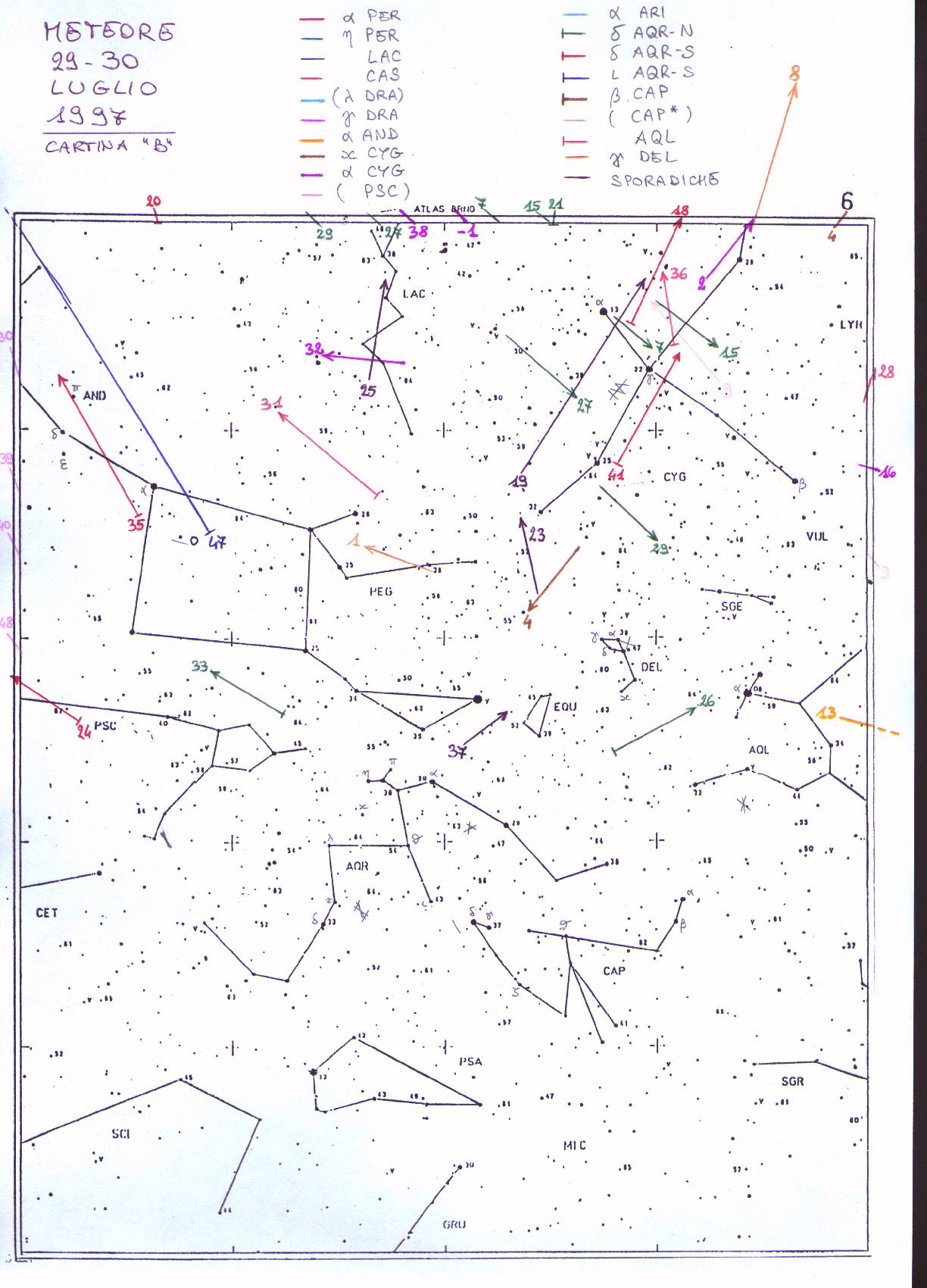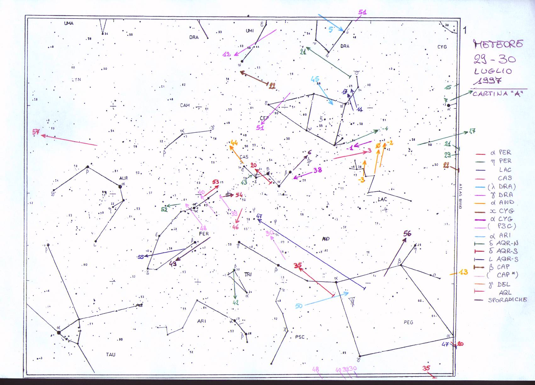 PERSEIDI, CASSIOPEIDI, ALFA CYG, GAMMA DRA, ALFA AND, AQUILIDI, PSC, CAPRICORNIDI, DELTA AQR N-S E VARIE 1997 |